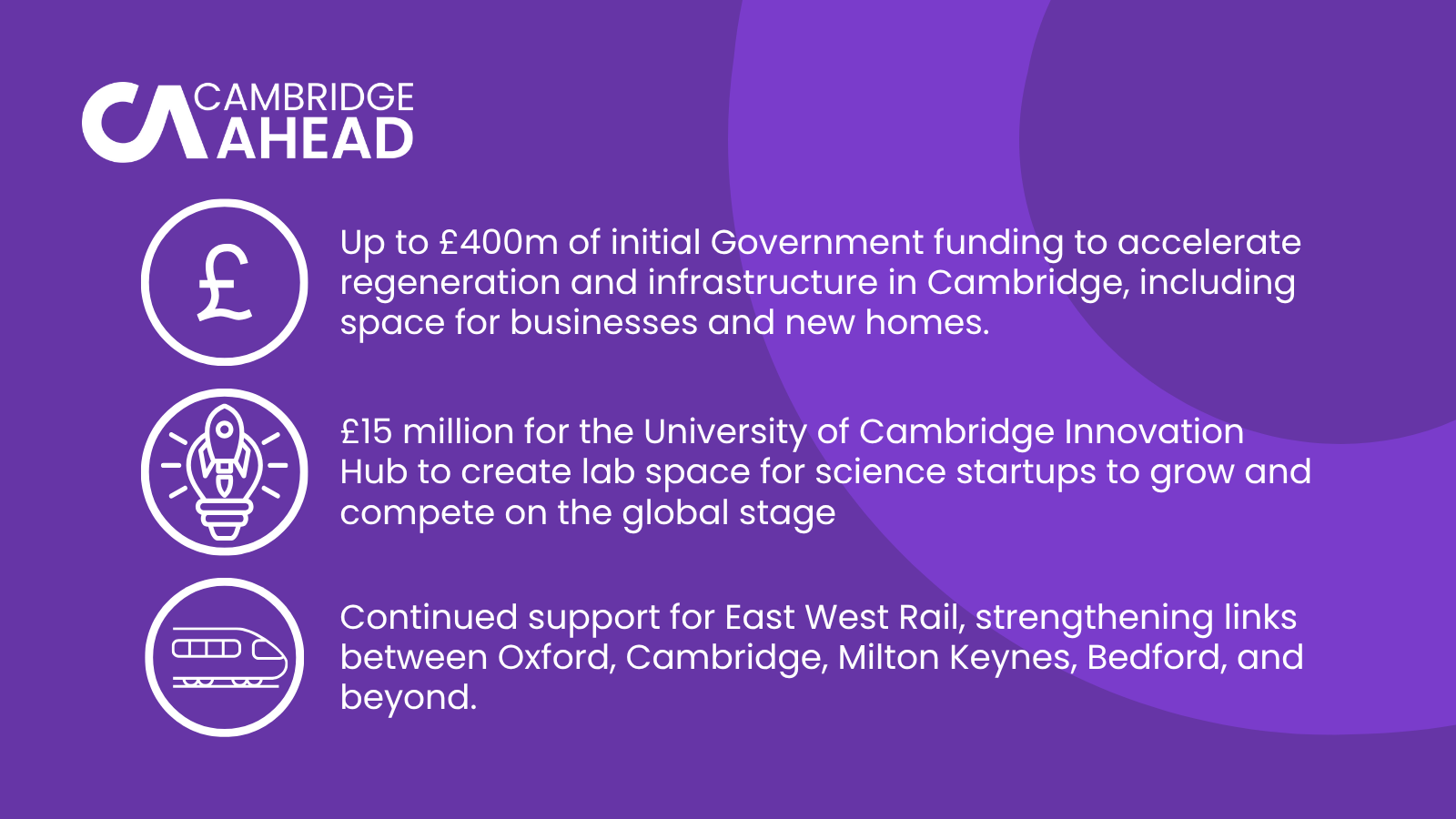 - Up to £400m of initial Government funding to accelerate regeneration and infrastructure in Cambridge, including space for businesses and new homes.